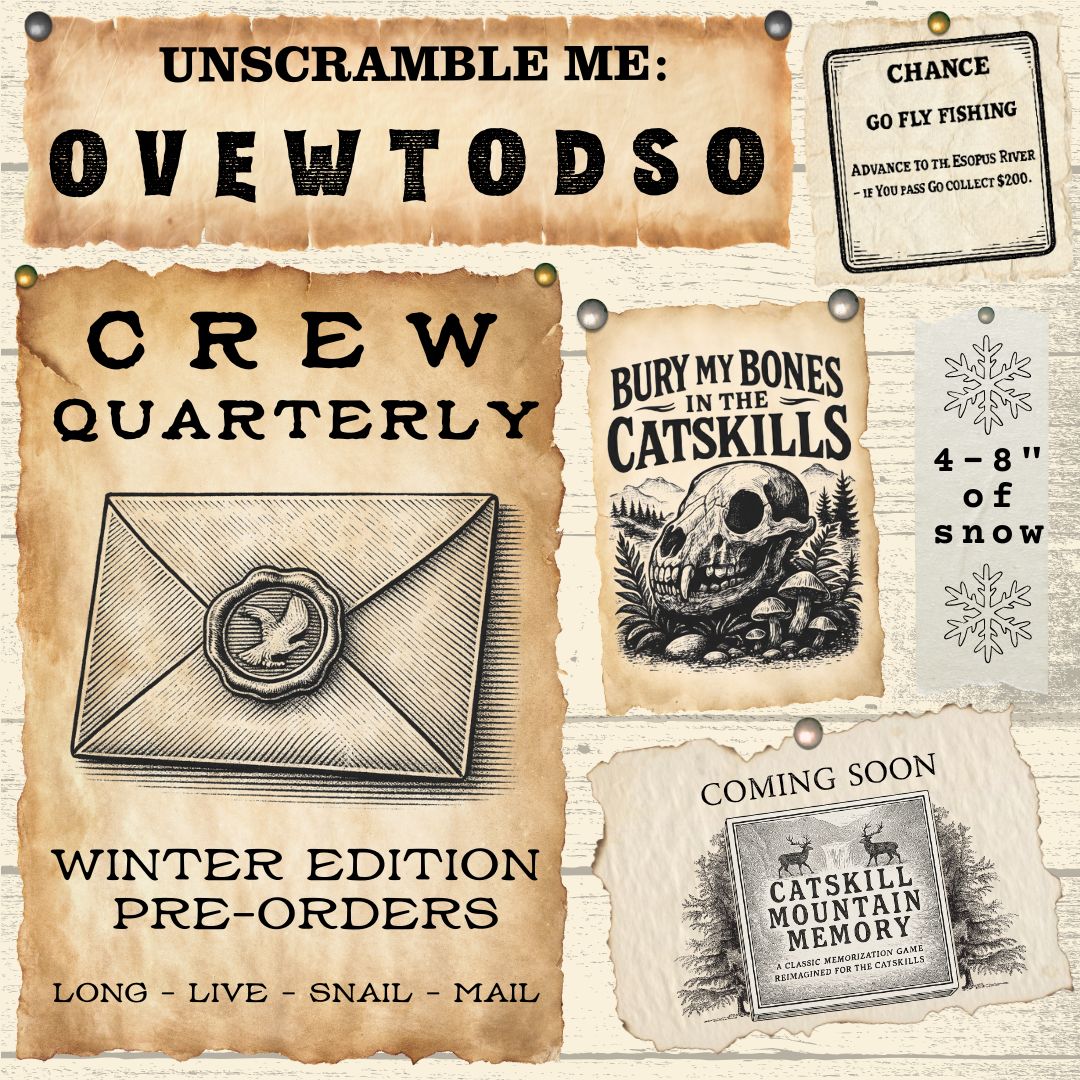 Crew Quarterly Four envelopes mailed to your door, stuffed to the brim with Catskill Goodness. P.S. I’ll plant a tree for each letter sent. Pre-order your Winter Edition today.