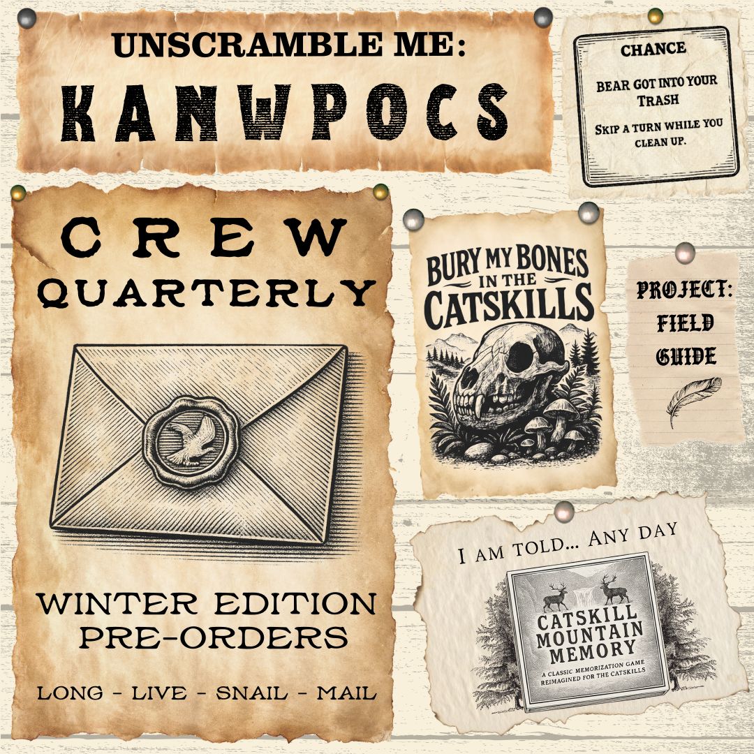 Crew Quarterly Four envelopes mailed to your door, stuffed to the brim with Catskill Goodness. P.S. I’ll plant a tree for each letter sent. Pre-order your Winter Edition today.