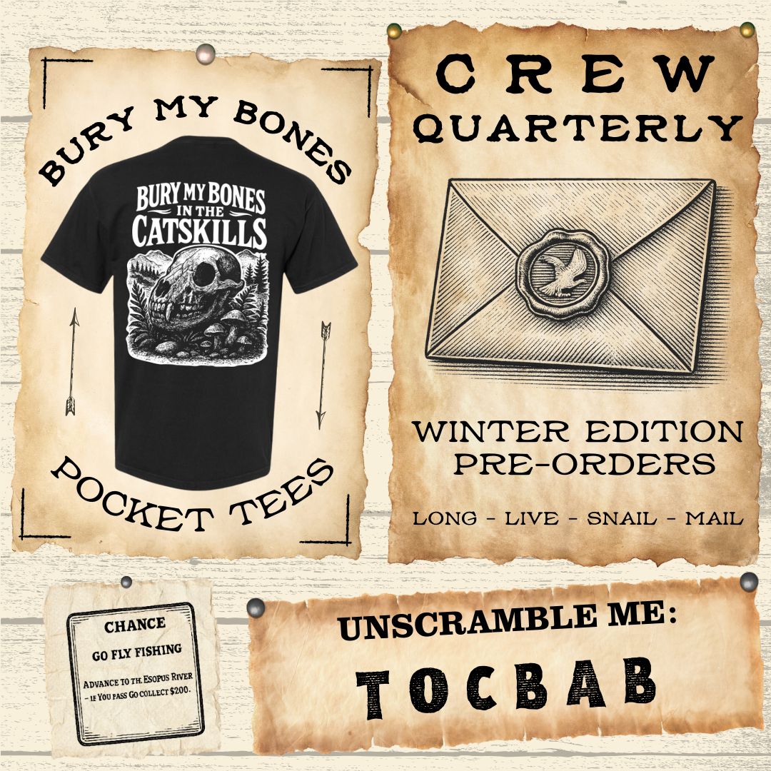 Crew Quarterly Four envelopes mailed to your door, stuffed to the brim with Catskill Goodness. P.S. I’ll plant a tree for each letter sent. The Fall Edition of the Quarterly is sold out. I’ll see all the folks who got one at the gathering on December 5th and I’m already deep into creating the Winter Edition! Pre-order your snail mail today.